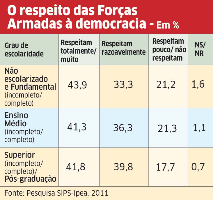 Vai aumentar o desgaste da imagem das Forças Armadas como instituições essenciais no jogo democrático. Já é baixa a nota que recebem quando se trata das relações com a democracia. Pesquisa do Ipea, de 2011, mostra isso. Considerado o grau de escolaridade, em nenhuma das faixas as FFAA alcançam sequer 50% de avaliação do respeito ao regime democrático (tabela).